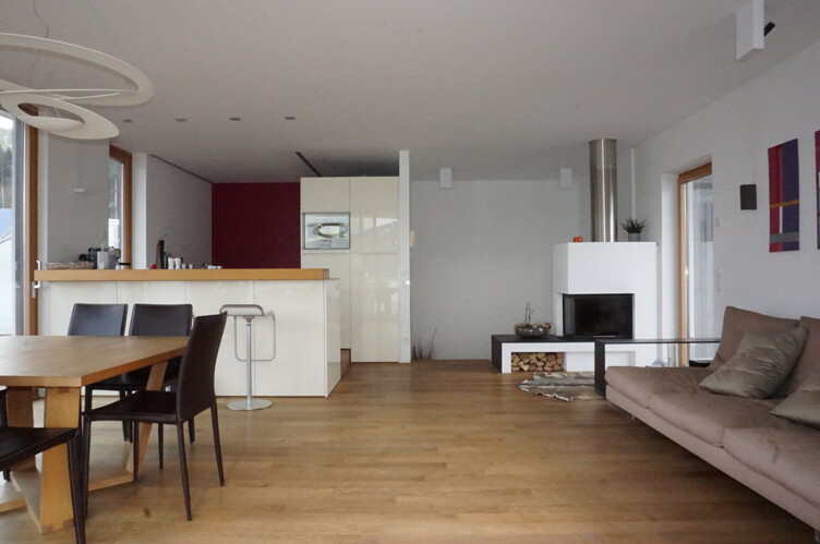 Die besondere Architektur und der durchdachte Grundriss machen diese Wohnung zu etwas Einzigartigem. Absolut barrierefrei betreten Sie die Wohnung und finden im linken Bereich den offenen Wohn- und Küchenbereich mit einer modern ausgestatteten Küche und Kochinsel.