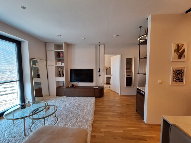 Über den Dächern von Innsbruck, im 10. Stock des PEMA II Gebäudes wird diese hochwertig ausgestattete Wohnung mit einem großzügigen Wohn- und Kochbereich, einem Schlafzimmer, einem Abstellraum und einem Badezimmer mit Infinity-Dusche vermietet.