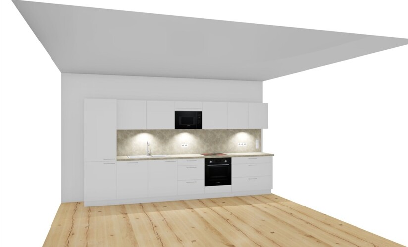 Die besondere Architektur und der durchdachte Grundriss machen diese Wohnung zu etwas Einzigartigem. Absolut barrierefrei betreten Sie die Wohnung und finden im linken Bereich den offenen Wohn- und Küchenbereich mit einer modern ausgestatteten Küche und Kochinsel.