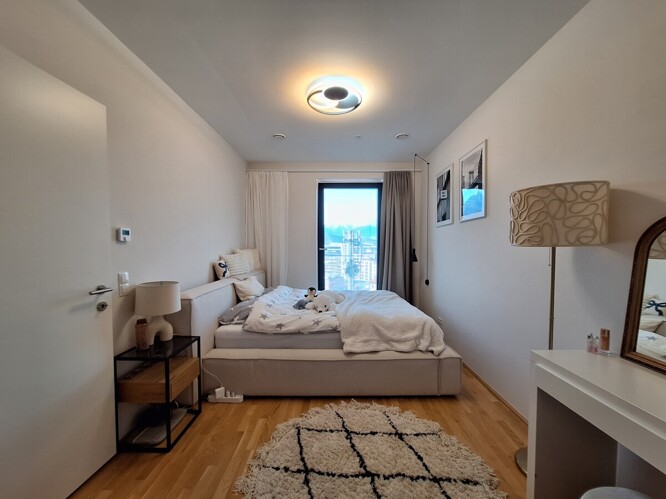 Über den Dächern von Innsbruck, im 10. Stock des PEMA II Gebäudes wird diese hochwertig ausgestattete Wohnung mit einem großzügigen Wohn- und Kochbereich, einem Schlafzimmer, einem Abstellraum und einem Badezimmer mit Infinity-Dusche vermietet.