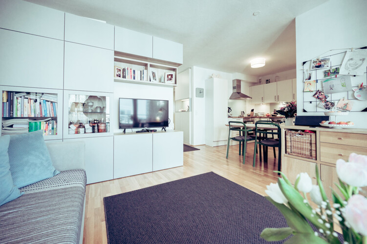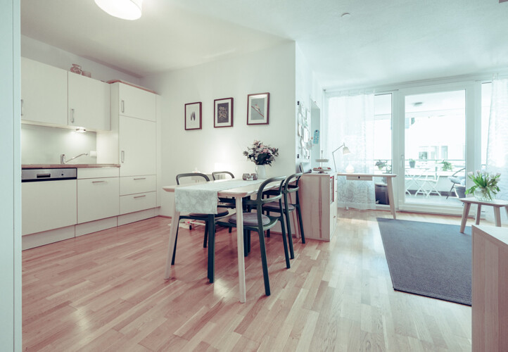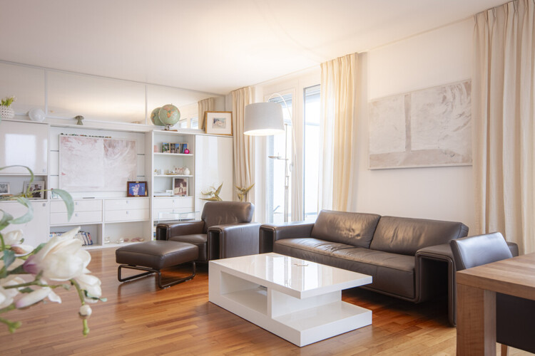 Ihr Familiendomizil. Die gut eingeteilte Wohnung im 3. OG des Hauses bietet Platz für zwei Schlafzimmer und einen großen Familienraum mit Essbereich und Wohnzimmer. Westloggia, Garagenplatz und Einbauküche runden das Angebot ab.